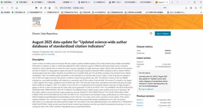江中新闻网讯(通讯员 饶金龙)近日,国际权威学术出版社爱思唯尔(Elevier)和美国斯坦福大学联合发布了全球前2%顶尖科学家榜单(World's Top 2% Scientists 2025),我校陈焕文、刘建国2位学者入选“终身科学影响力排行榜”,朱卫丰、陈焕文、杨明、刘建国、张婧、马勤阁、张华7位学者入选“年度科学影响力排行榜”。 (原文:https://elsevier.digitalcommonsdata.com/datasets/btchxktzyw/8) 该榜单通过基于其论文引用数、h因子、合著者修正的hm因子、单独或第一作者的文章引用数等综合参数,遴选出世界排名前2%的科学家,涵盖22个领域和174个子领域。榜单提供了面向科学家科研表现的衡量指标,客观真实反映科学家的学术水平与行业认可度。迄今为止,已经发布了八版榜单。 近年来,我校聚焦国家和地方发展战略需求,以中医药产业关键科学问题和产业发展技术难题为导向,坚持以特色发展打造竞争力优势,用一流标准引领高质量发展,取得了一系列标志性成果,学校整体科研水平以及科研影响力得到显著提升。 |