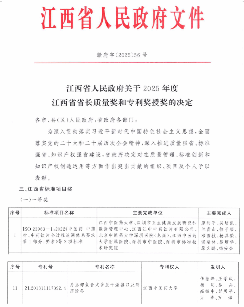 江中新闻网讯(通讯员 董燕婧 张珉 易炳学 王学成)近日,江西省人民政府正式公布2025年度江西省省长质量奖和专利奖授奖的决定,我校科研创新成果再获重大突破——由学校主导制定的ISO 23963-1:2022《中医药 中药材、中药饮片全过程追溯体系要求 第1部分:要素》等2项国际标准,成功斩获标准项目一等奖(全省仅5个,高校唯一一个);发明专利“易拆卸复合式多层干燥器以及制药设备”(专利号:ZL201811117392.4)喜获江西省专利奖(全省仅15个,高校仅2个),彰显了我校在标准化建设与知识产权创新领域的雄厚实力。