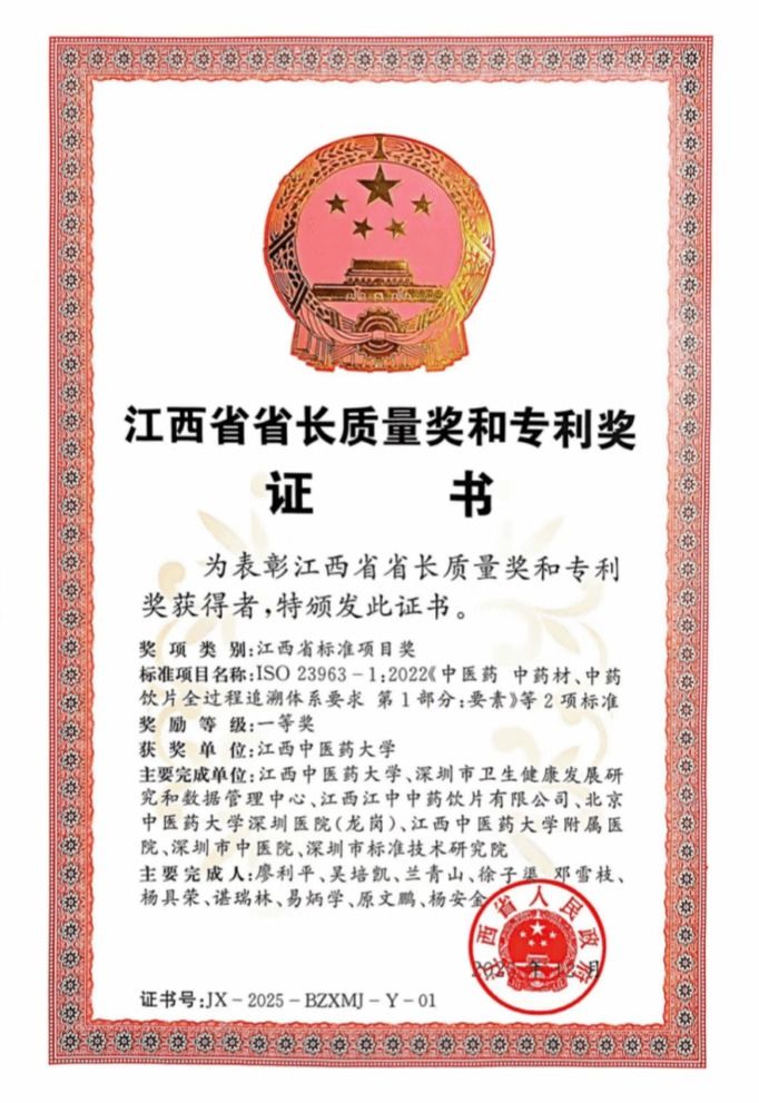 江中新闻网讯(通讯员 孙文秀 张珉)2 月 28 日,全省质量大会在昌召开,省长叶建春出席会议并为 2025 年度省长质量奖获奖单位和个人颁奖。由学校主导制定的ISO 23963-1:2022《中医药 中药材、中药饮片全过程追溯体系要求 第1部分:要素》等2项国际标准,成功斩获标准项目一等奖(全省仅5个,高校唯一一个);发明专利“易拆卸复合式多层干燥器以及制药设备”(专利号:ZL201811117392.4)喜获江西省专利奖(全省仅15个,高校仅2个),充分彰显了我校在标准化建设与知识产权创新领域的硬核实力与领先优势。