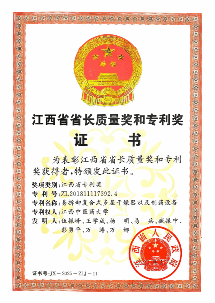 在知识产权创新领域,我校斩获专利奖的 “易拆卸复合式多层干燥器以及制药设备” 发明专利,由伍振峰、王学成、杨明等教师团队研发。